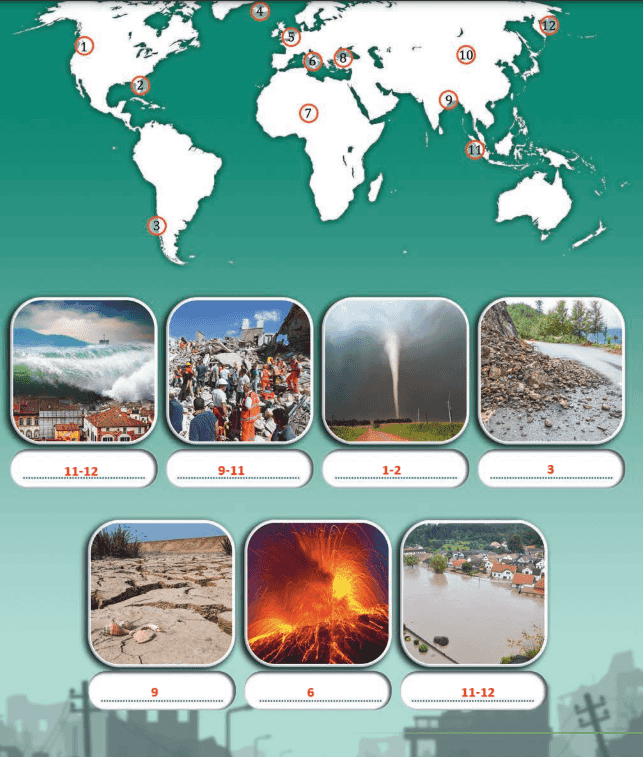 Görselleri verilen afet türlerinin, haritadaki numaralanmış alanlardan hangilerinde meydana gelme ihtimalinin yüksek olduğunu belirleyiniz ve görsellerin altına yazınız.