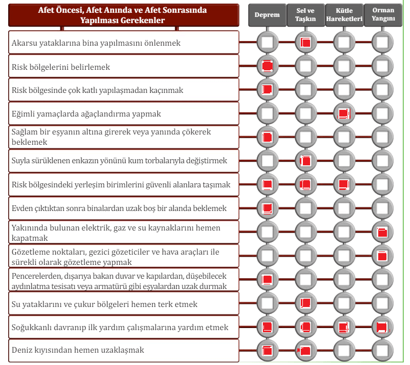Aşağıdaki tabloda verilmiş olan afetlerle mücadele konusundaki yapılması gerekenlerin hangi afet türü veya türleri için geçerli olduğunu tabloda işaretleyiniz.