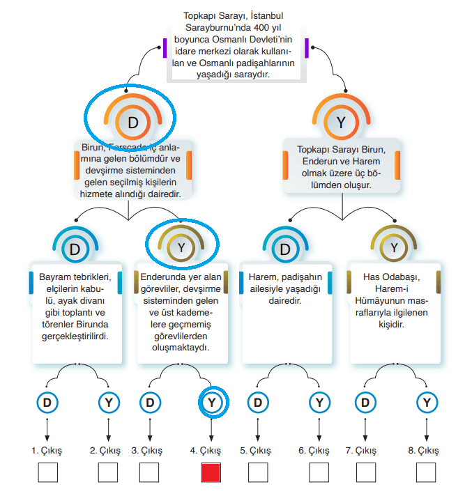 17. Aşağıda birbiriyle bağlantılı Doğru / Yanlış şeklinde ifadeler içeren bir soru verilmiştir. İlk ifadeden itibaren doğruları takip ederek çıkışa ulaşınız.