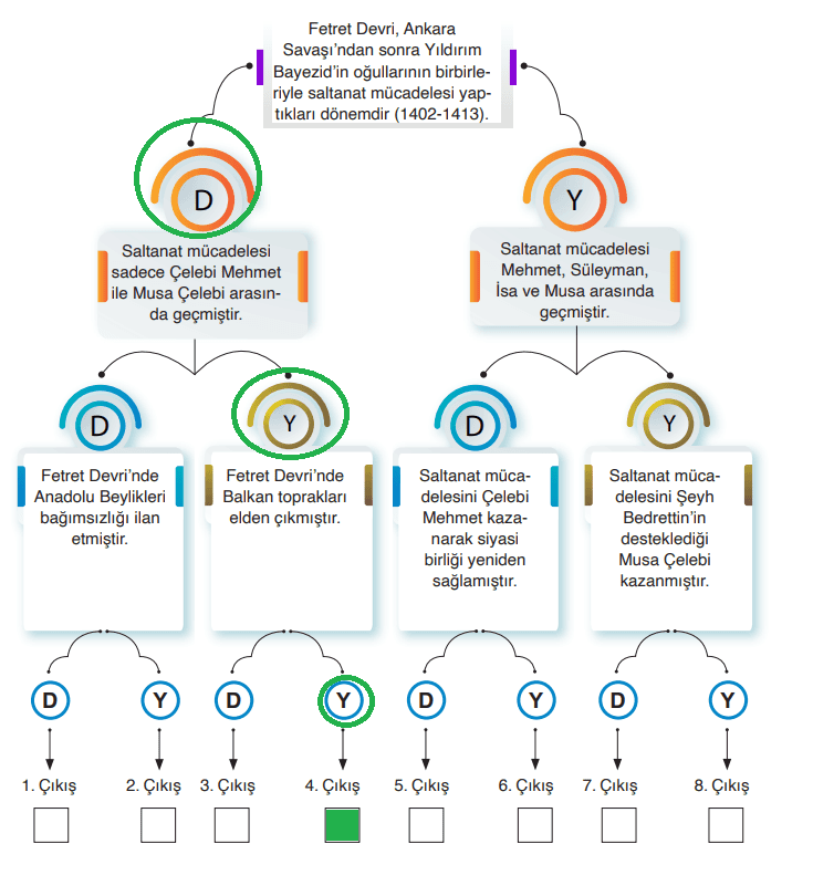 18. Aşağıda birbiriyle bağlantılı Doğru / Yanlış şeklinde ifadeler içeren bir soru verilmiştir. İlk ifadeden itibaren doğruları takip ederek çıkışa ulaşınız.