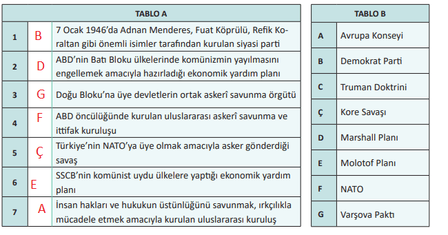 Tablo A’daki ifadelerle Tablo B’deki kelime veya kelime gruplarını eşleştirerek doğru harfi Tablo A’daki boşluklara yazınız.