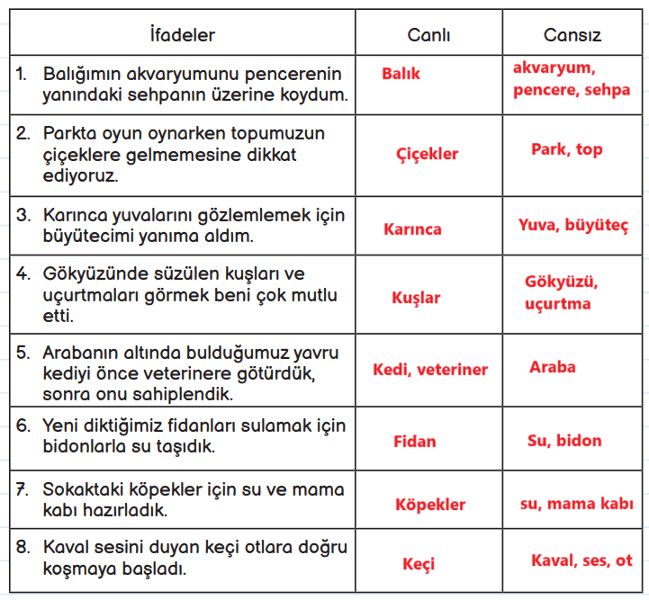 1. Cümlelerde geçen canlı ve cansız varlıkları bulunuz. Tablodaki doğru yerlere yazınız.