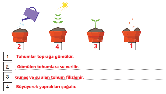 3. Bir bitkinin yaşam döngüsünden bazı görseller verilmiştir. Görselleri bitkinin gelişim aşamalarına göre numara vererek sıralayınız. Bu aşamaları açıklayınız.