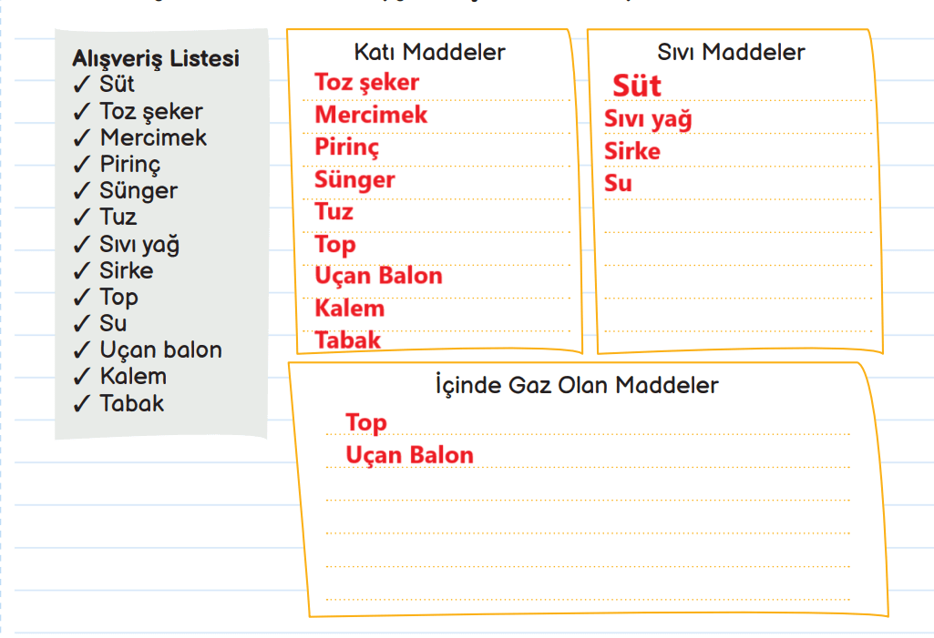 1. Yılmaz ailesinin alışveriş listesi aşağıdaki gibidir. Listede verilen maddeleri hâllerine göre sınıflandırınız. Uygun başlıkların altına yazınız.
