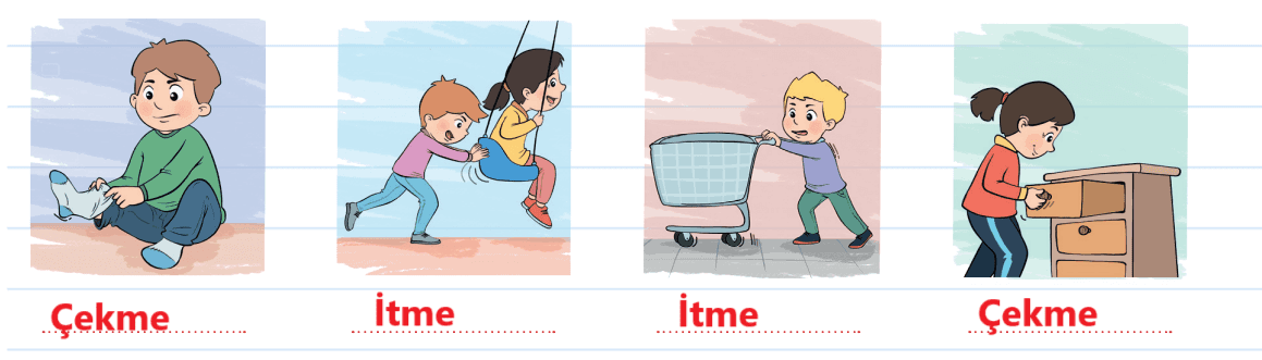 1. Görsellerde ifade edilen kuvvetlerin itme mi, çekme mi olduğunu bulunuz. Görsellerin altındaki noktalı alanlara yazınız. Aşağıdaki boş alanlara, itme ve çekme kuvvetine örnek olacak birer görsel çiziniz.