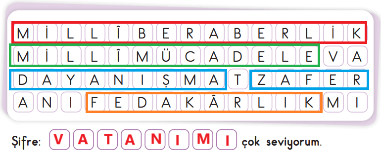 1. Aşağıda verilen bulmacada, konuda öğrendiğiniz sözcükleri bularak boyayınız. Boyamadığınız harfleri sıra ile kutucuklara yazarak şifreyi bulunuz.