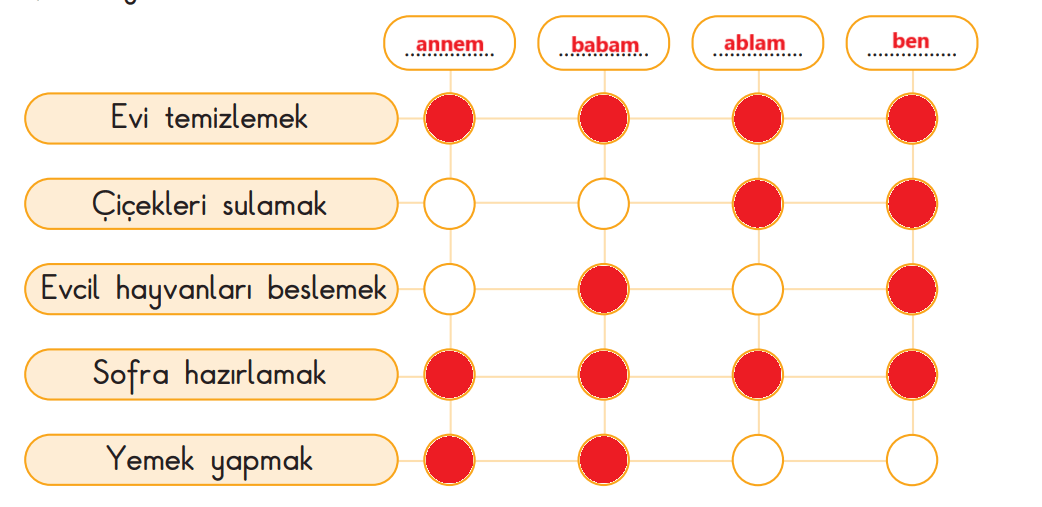 1. Tablodaki noktalı yerlere adınızı ve aile bireylerinizin adlarını yazınız. Tabloda yazan işlerin, ailenizde kimler tarafından yapıldığını işaretleyiniz.