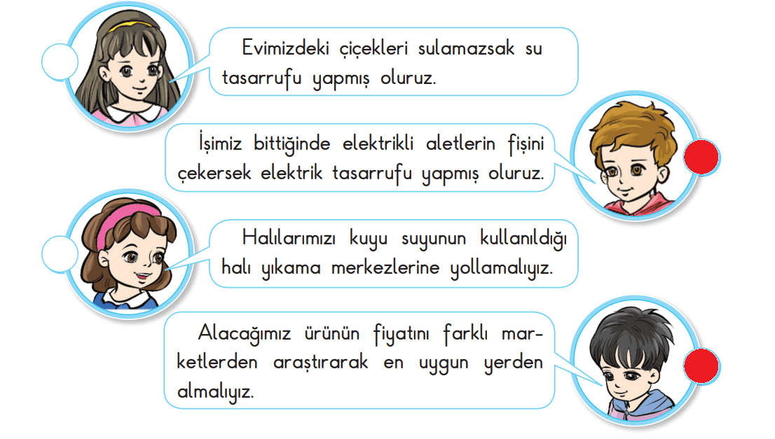 1. Aşağıdaki çocuklardan, kaynakların tasarruflu kullanımı ile ilgili doğru önerilerde bulunanların yanındaki kutucuğu boyayınız.