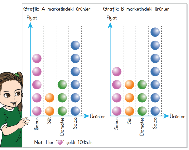 Bunun için babası ile evinin çevresindeki marketlerde satılan aynı marka ve aynı miktardaki ürünlerin fiyatlarını araştırdı. Edindiği bilgilerle aşağıdaki grafikleri hazırladı. Grafikleri inceleyiniz. Soruların cevaplarını grafiklere uygun şekilde, noktalı yerlere yazınız.