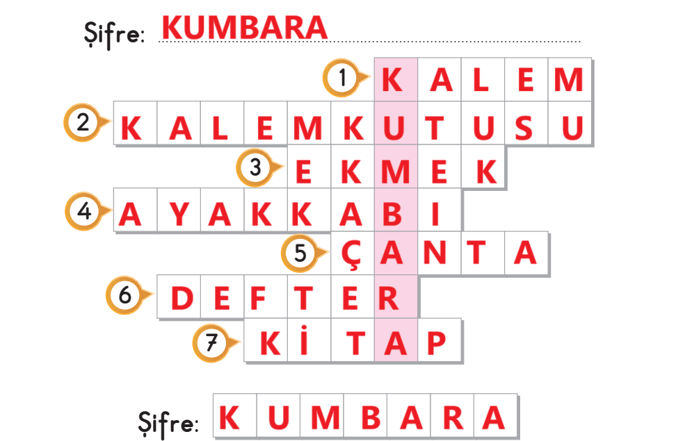 1. Aşağıda numaralandırılarak verilen görsellerden ihtiyaç grubunda olanların ismini bulmacadaki yerine yazınız. Renkli bölümdeki harfleri yukarıdan aşağıya doğru sırayla kutucukların içine yazarak şifreyi bulunuz.