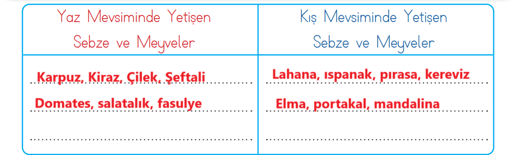 Aşağıdaki tabloda, her mevsim bulunabilen bazı meyve sebzeler yer almaktadır. Bu meyve sebzelerden hangilerini kış mevsiminde, hangilerini yaz mevsiminde tüketmeyi tercih ettiğinizi işaretleyiniz. Noktalı alana hem yaz hem kış mevsiminde yetiştirilen meyve sebzelere bir örnek yazarak tabloyu tamamlayınız. Tamamladıktan sonra aşağıdaki soruyu cevaplayınız.