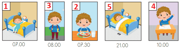 Yukarıdaki görsellerde Serhat’ın bir gün içinde yaptıkları karışık şekilde verilmiştir. Saatlere dikkat ederek görselleri inceleyelim. Görselleri sabahtan akşama doğru numaralandırarak sıralayalım.