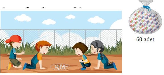 Bir torbada toplam 60 adet bilye vardır. 4 arkadaş bu bilyeleri eşit paylaştığına göre kişi başı kaç adet bilye düşmüştür?