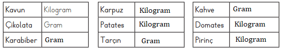 16. Aşağıdaki tablolarda verilen gıdalara uygun olan ölçme birimlerini örneklerdeki gibi yazınız.