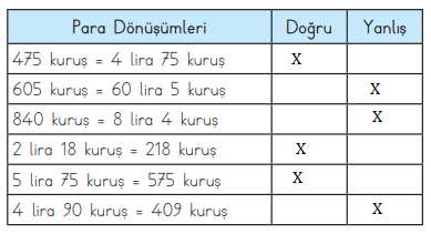15. Aşağıdaki tabloda verilen para dönüşümlerinin doğru mu yanlış mı olduğunu belirleyiniz. Yanındaki ilgili kutuyu işaretleyiniz.