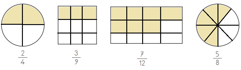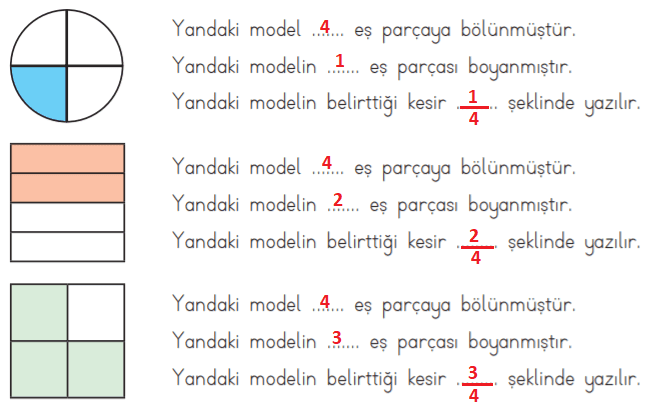 2. Aşağıdaki tabloya, modellerle gösterilen boyalı alanların belirttiği kesirleri ve bu kesirlerin okunuşlarını yazınız.