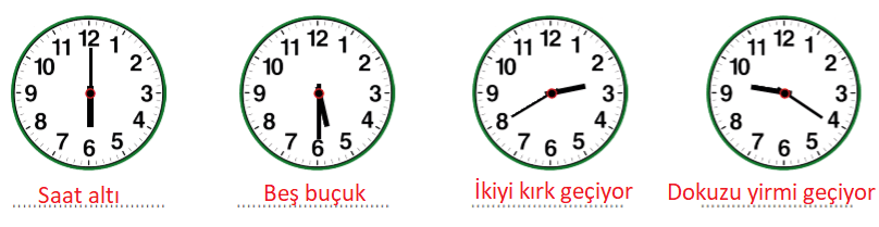10. Aşağıdaki saatlerin okunuşlarını altlarına yazınız.