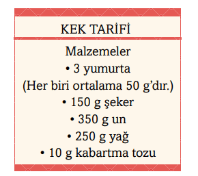 Yanda verilen malzemeler kullanılarak kek yapılacaktır. Kek için toplam kaç gram malzeme kullanılır?