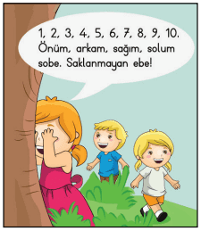 Ayşe ve arkadaşları bahçede saklambaç oynarlar. Ayşe ebe olur ve sesli bir şekilde saymaya başlar. Yandaki görseli inceleyelim. Ayşe kaçar sayma yapmıştır? Düşünelim.