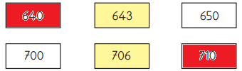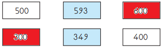 2-) Aşağıdaki renkli kutularda verilen sayıları en yakın yüzlüğe yuvarlayalım. Doğru cevabın yazılı olduğu kutuyu kırmızı renge boyayalım.