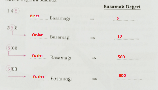 2.Aşağıdaki sayılarda 5 rakamının bulunduğu basamağın adını yazınız. Basamak değerini bulunuz.