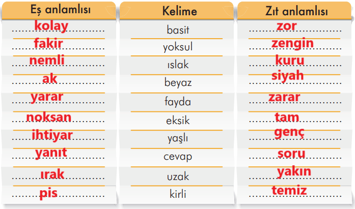 Aşağıdaki tabloda verilen kelimelerin eş ve zıt anlamlılarını noktalı yerlere yazınız.