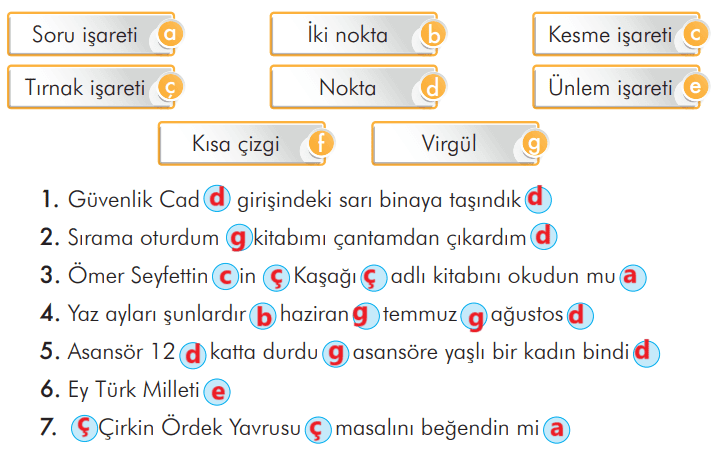 Ç. Aşağıdaki cümlelerde dairelerin içinde bulunması gereken noktalama işaretlerini belirleyiniz. Noktalama işaretleriyle eşleştirilen harfleri ilgili dairelere yazınız.