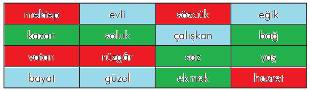 D. Aşağıda tabloda verilen kelimeleri inceleyiniz. Kelimelerin eş anlamlısı olanları kırmızıya, zıt anlamlısı olanları maviye, eş sesli olanları ise yeşile boyayınız.