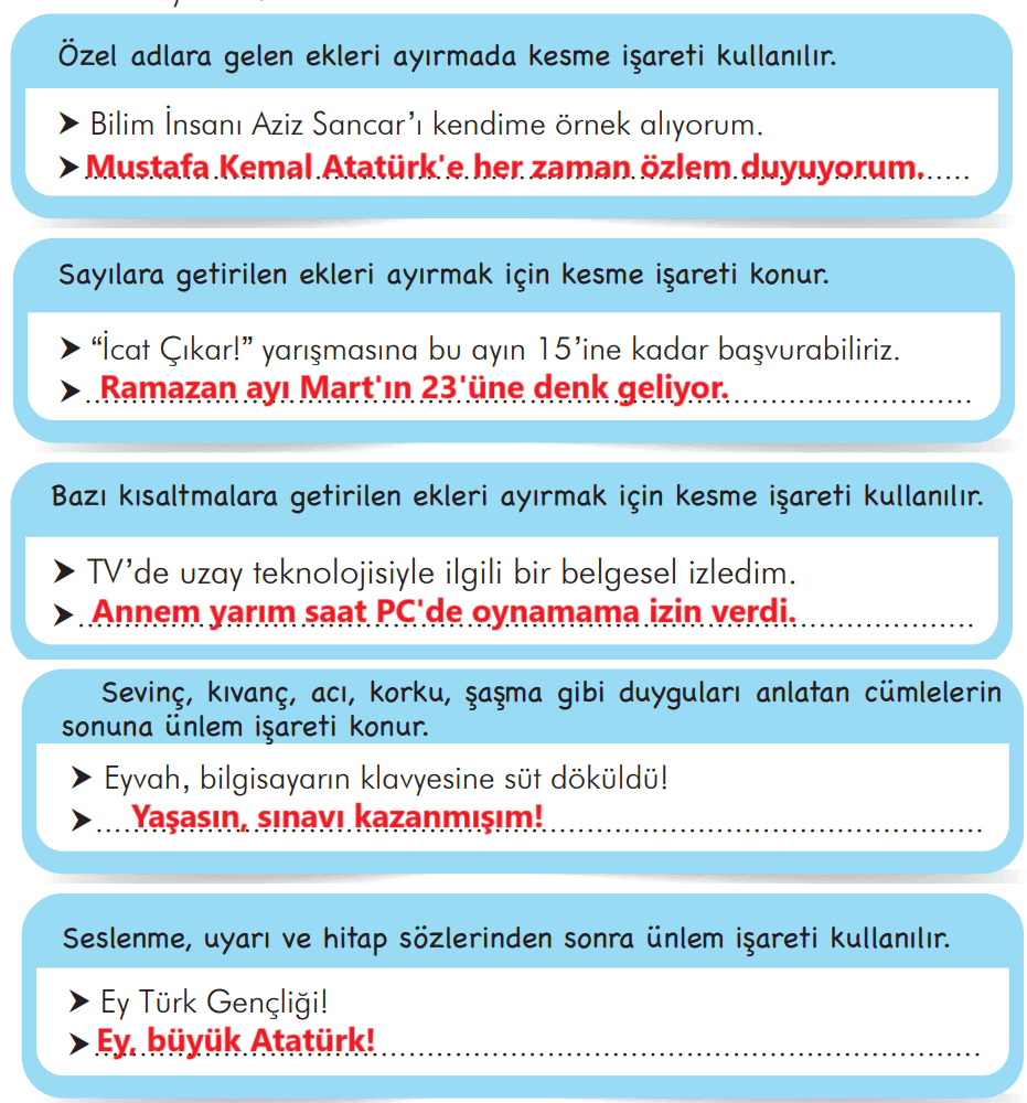 Kesme işareti ve ünlem işaretinin kullanıldıkları yerlerle ilgili aşağıdaki açıklamaları okuyup örnek cümleleri inceleyiniz. Siz de açıklamalara uygun birer cümle yazınız.