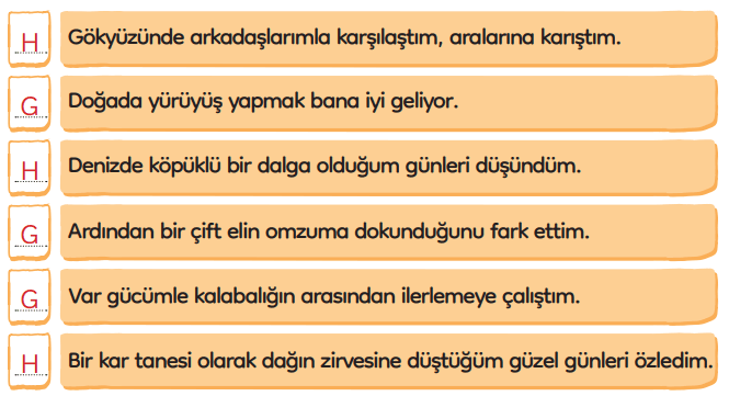 1. Gerçek ögelerin yer aldığı cümlelerin başına “G”, hayalî ögelerin yer aldığı cümlelerin başına “H” yazınız.