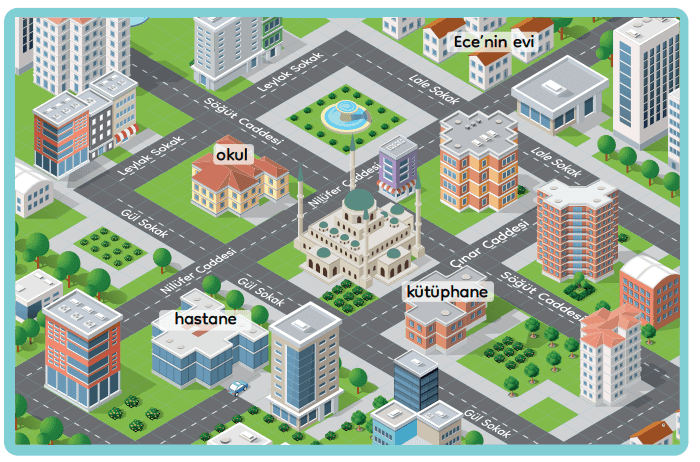 Cevap: Evinden çıkan Ece, Nilüfer Caddesi boyunca yürümeli, ikinci soldan Gül sokağına girerek hastaneye ulaşabilir.