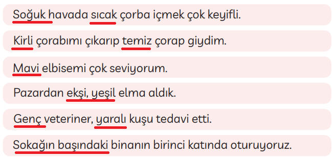 10. Aşağıdaki cümlelerde varlıkların özelliklerini bildiren sözcüklerin altını çiziniz.