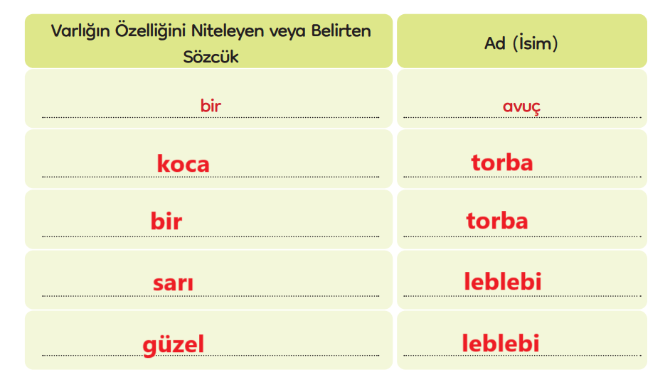 2. Siz de şiiri bir kez daha dinleyerek şiirde geçen isimleri ve isimlerin özelliklerini niteleyen veya belirten sözcükleri örnekteki gibi yazınız.