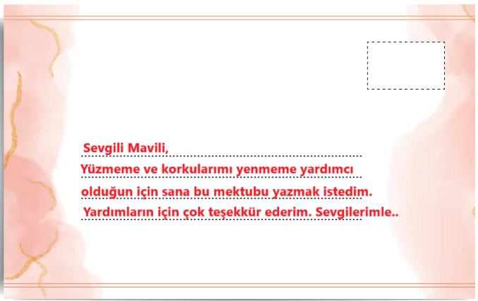 Perdeli, Mavili’ye teşekkür etmek için bir kartpostal göndermek istiyor. Perdeli’nin Mavili’ye göndereceği kartpostalın ön yüzüne bir resim çiziniz. Arka yüzüne ise iletinizi yazınız.