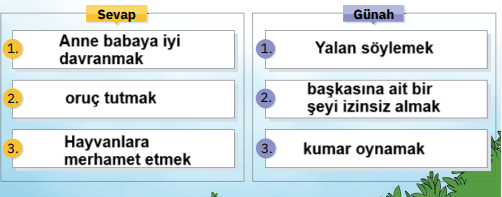 Aşağıdaki kutulara, aile büyüklerinizden de yardım alarak günah ve sevap davranışlara üçer örnek yazınız.