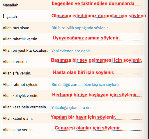 Aşağıdaki ifadelerin hangi durumlarda söylendiğini, aile büyüklerinizden yardım alarak ve örneklerden de yararlanarak karşılarına yazınız.