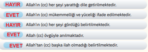 Sübhaneke duasında aşağıda belirtilen hususlardan hangilerinden bahsedildiğini belirleyiniz. Duada bahsedilen hususların başına “Evet”, bahsedilmeyenlerin başına ise “Hayır” yazınız.