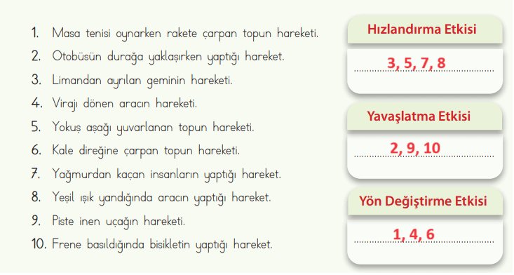 Aşağıdaki hareket durumlarının kuvvetin hangi etkisine uygun olduğunu belirleyiniz. Belirlediğiniz hareket durumunun numarasını ilgili alana yazınız. Numaraları birden fazla etki için kullanabilirsiniz.