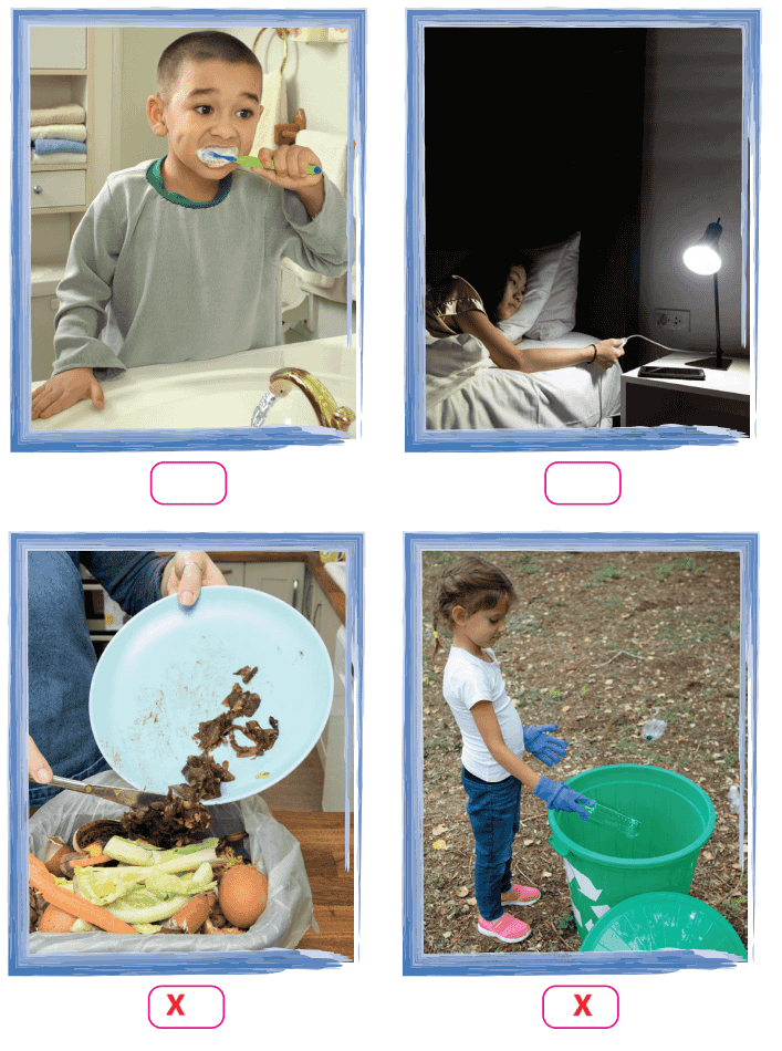 1. Aşağıdaki görselleri inceleyiniz. Kaynakların tasarruflu kullanımını yansıtan görsellerin altındaki kutucuğu “X” ile işaretleyiniz.