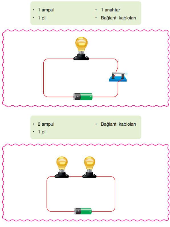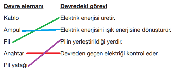 Cevap: Bir elektrik devresinin kurulabilmesi için ampul, pil, kablo ve anahtara ihtiyaç vardır.