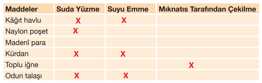 Defterinize aşağıdaki gibi bir tablo çiziniz. Etkinlikteki gözlemleriniz doğrultusunda tabloyu “X” işareti ile doldurunuz.