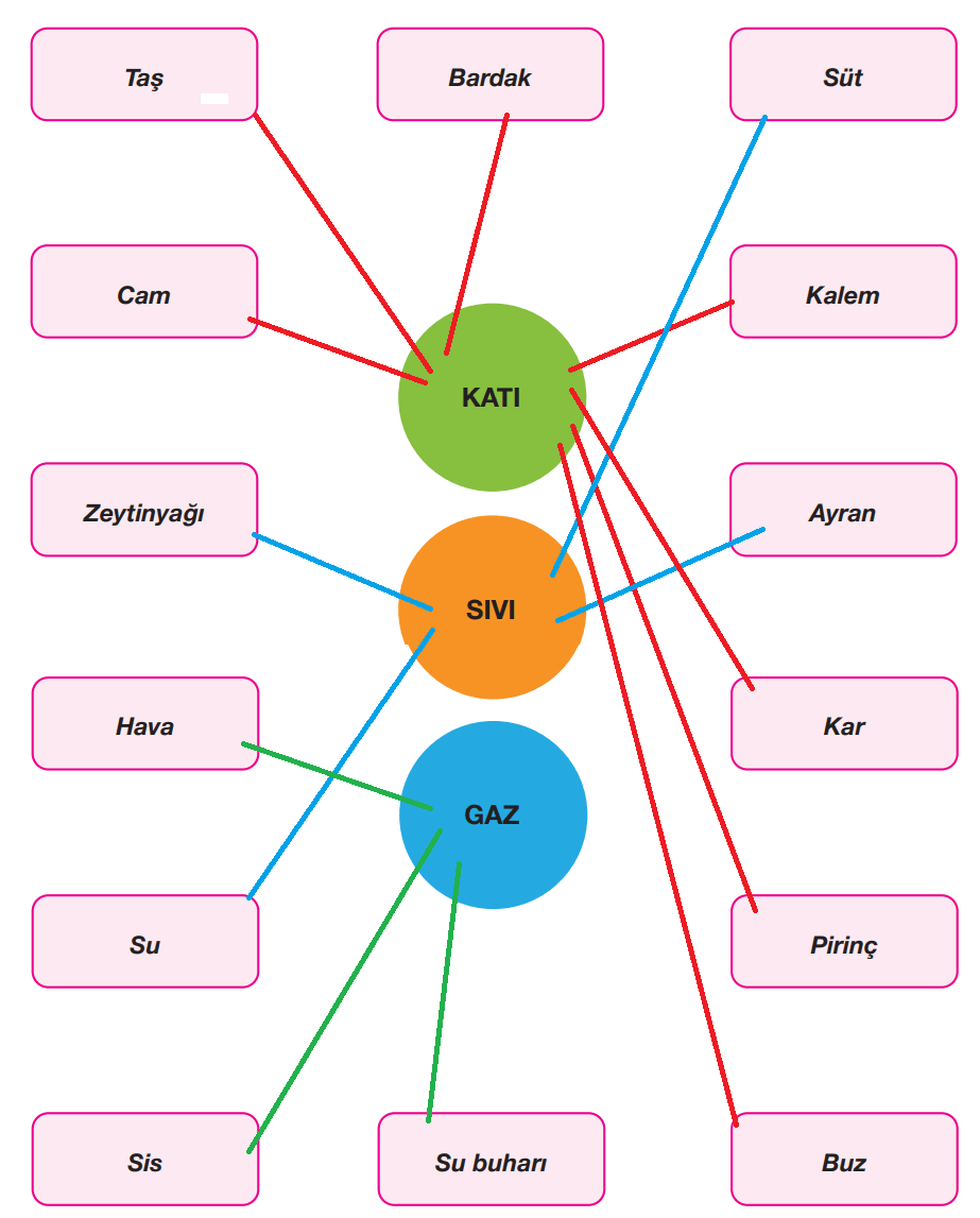 Defterinize aşağıdaki gibi bir tablo çiziniz. Etkinlikteki maddeleri katı, sıvı ve gaz oluşlarına göre sınıflandırarak tabloyu doldurunuz.