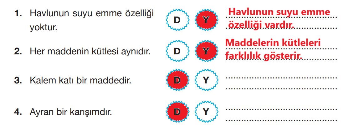 A. Aşağıdaki ifadeleri dikkatlice okuyunuz. İfade doğru ise “D”, yanlış ise “Y” yazan kutucuğu işaretleyiniz. Yanlış olan ifadelerin doğrusunu noktalı yerlere yazınız.