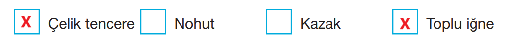 6. Mıknatıs tarafından çekilen maddelerin altındaki kutucuğu “X” ile işaretleyiniz.