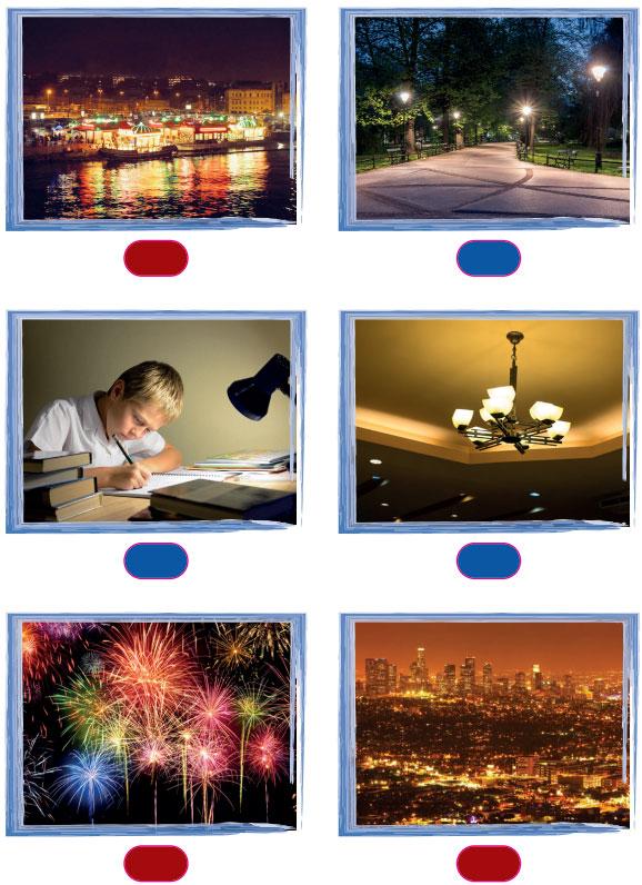 2. Aşağıdaki görsellerde ışık kirliliği olan ortamların altındaki kutuyu kırmızıya, ışık kirliliği olmayanların altındaki kutuyu maviye boyayınız.