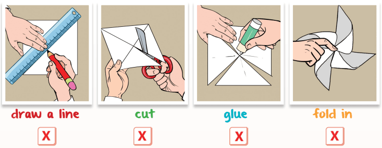 C. Look at the pictures. Follow the steps. Make a button spinner.