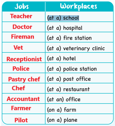Çeviri: Resimlere bakın. Mesleklerini ve işyerlerini yazın.