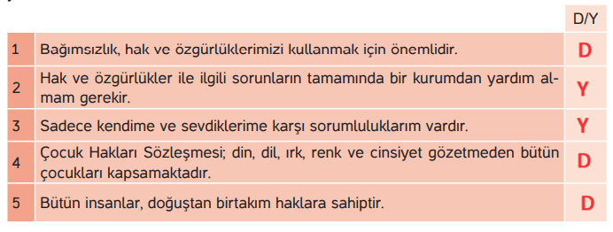 3. Yalnız çocukların değil yetişkinlerin de hak ve özgürlükleri ihlal edilebilmektedir. Çevrenizdeki yetişkinlere hangi hak ve özgürlüklerinin ihlal edildiğini ve bu ihlallere nasıl çözüm bulduklarını sorunuz. Çocukların buldukları çözümler ile yetişkinlerin çözümleri arasında fark var mıdır? Araştırınız.