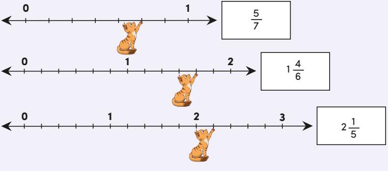 3. Aşağıdaki sayı doğruları üzerinde Tortop’un patisiyle dokunduğu yerlere gelmesi gereken kesirleri boş kutulara yazınız.