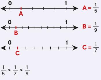 2. Aşağıda sayı doğrusu üzerinde verilen A, B, C kesirlerini bulunuz. Bu kesirleri büyükten küçüğe doğru sembol kullanarak karşılaştırıp sıralamayı boş kutuya yazınız.